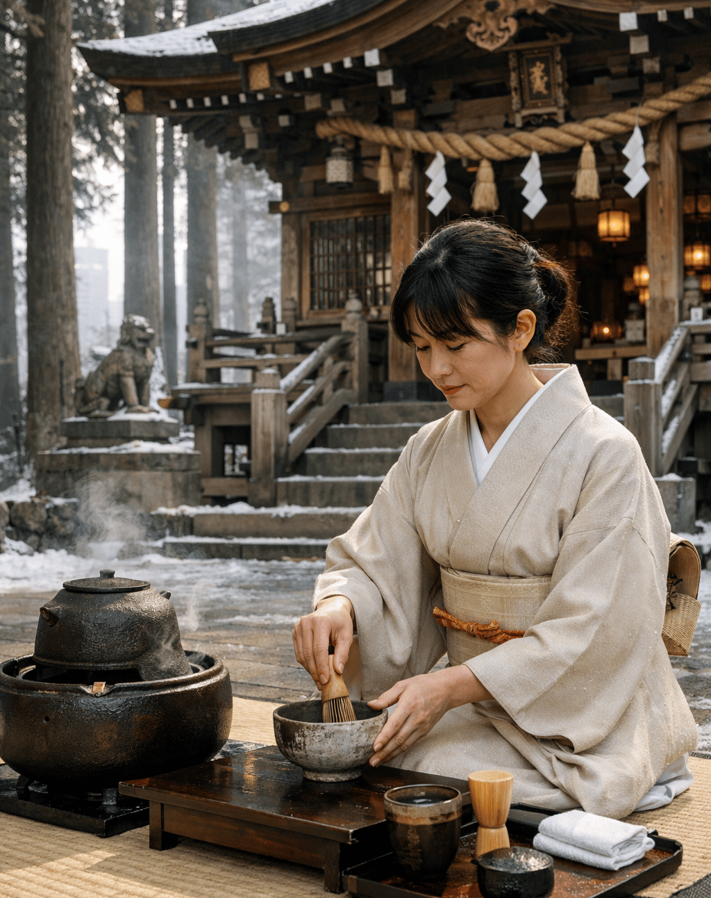 Der traditionelle Teeraum ist klein, reduziert und frei von Ablenkung. Niedrige Eingänge zwingen selbst hochgestellte Gäste zur Verbeugung – ein symbolischer Akt der Gleichheit. Der Raum dient nicht dem Komfort, sondern der inneren Sammlung.