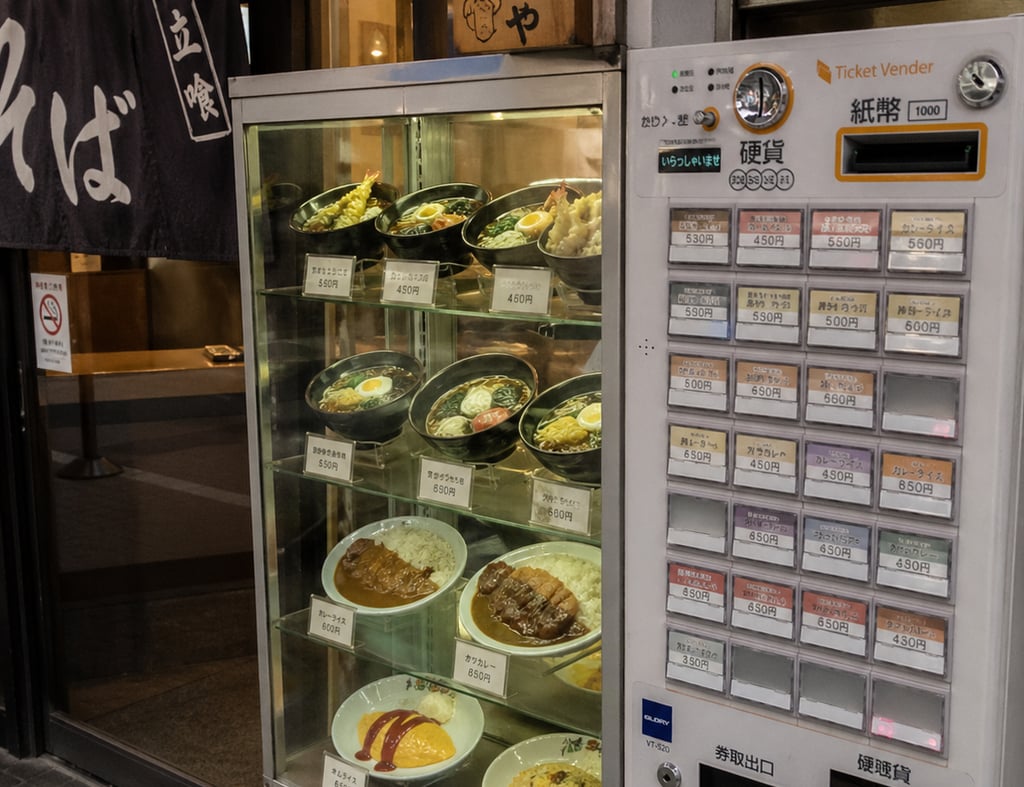 Ein 食券機 ist ein Ticketautomat für Speisen. Gäste wählen am Automaten ein Gericht, bezahlen und erhalten ein Ticket, das sie an der Theke oder beim Personal abgeben. Besonders häufig findet man solche Automaten in Ramenläden, Kantinen und schnellen Alltagsrestaurants.