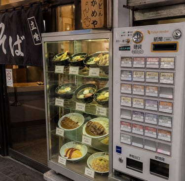 Wer durch japanische Einkaufsstraßen geht, begegnet ihnen oft noch vor dem ersten Duft aus der Küche: glänzende Schalen mit Ramen, sorgfältig gelegte Tempura, Curryreis mit genau modellierter Sauce, ein Omelett, dessen Oberfläche weich und warm wirkt, obwohl es aus Kunststoff besteht. Daneben, besonders in kleinen Ramenläden, Bahnhofsrestaurants oder Kantinen, steht nicht selten ein Automat. Man wählt ein Gericht, bezahlt, erhält eine Marke oder einen Bon und reicht ihn weiter. Erst dann beginnt die Mahlzeit.