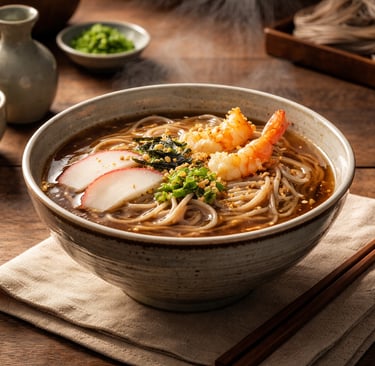Für Toshikoshi Soba wird häufig eine warme Schale serviert, kake soba (かけそば) oder in verwandter Form: Nudeln im heißen Sud, mit einfachen Toppings, die nicht ablenken, sondern akzentuieren.